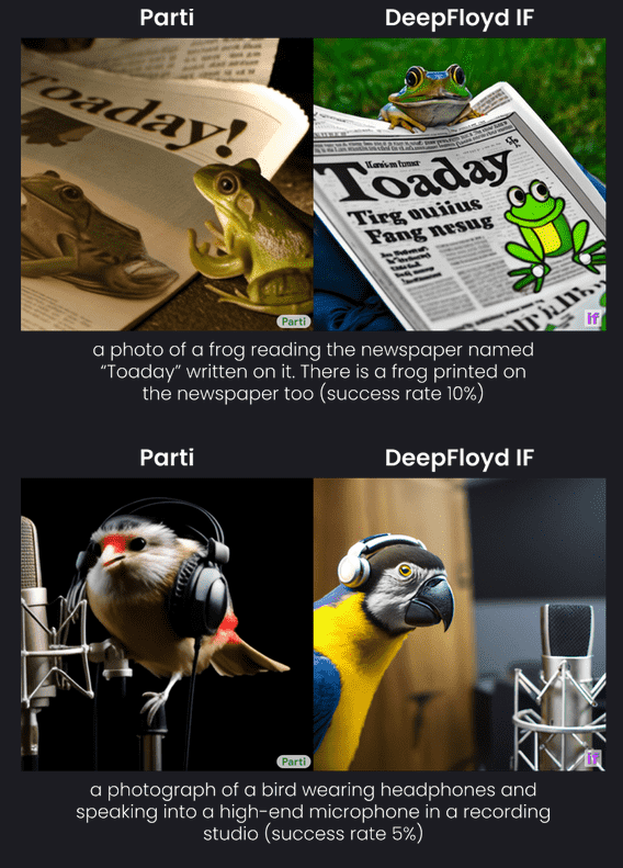 딥플로이드IF는 다른 모델이 서투른 문자 반영이 가능하며 이미지 내에 문자를 올바르게 반영시킬 수 있다. 노래 가사를 딥플로이드IF로 생성해 이미지에 반영하고 영상화할 수 있다. 관련 내용은 이곳에서 확인할 수 있다.