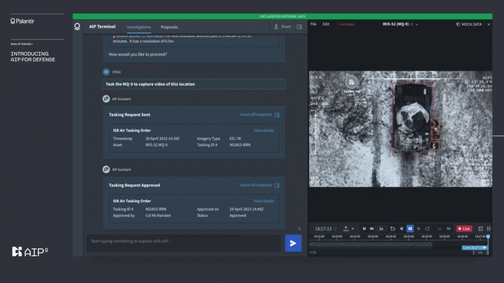 팔란티어는 소개 영상에서 군이 AI를 이용하는 방법에 대해 설명하고 있다. 시나리오는 동유럽 내 활동을 감시하는 군사 운영자가 군 근처에 적이 집결했다는 경고를 AIP로 받는 것에서 시작한다. 경고를 받은 운영자는 챗봇에게 자세한 내용을 보여달라고 요청하고 자세한 정보를 얻은 뒤 적 유닛이 뭔지 추측하도록 AI에 요청한다.