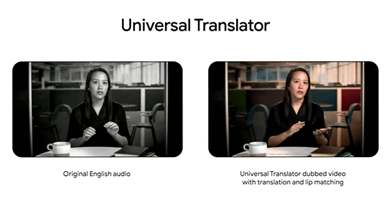 구글은 또 영상 음성을 자동 인식해 음성 톤을 바꾸지 않은 채 다른 언어로 변역해주는 AI 기술인 유니버설 번역기(Universal Translator)도 발표했다. 구글은 이 기술을 이용해 대학 온라인 강의를 자동 보충하는 데모도 함께 공개했다. 오리지널 영상은 영어로 강의가 진행되지만 변환 버전에선 원본과 같은 성색을 유지하면서 다른 언어로 강의를 진행한다. 음성에 맞춰 입 움직임도 변화하고 있다.