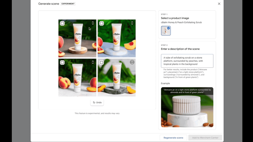 프로덕트 스튜디오는 원본 제품 이미지를 사용해 텍스트 프롬프트를 기반으로 새로운 이미지를 생성할 수 있는 도구다. 따라서 사용자는 계절이나 캠페인에 따라 적절한 상품 이미지를 새롭게 생성할 수 있다고 한다. 예를 들어 화장품 이미지에 복숭아로 둘러싸여 있고 열대 식물이 배경이 있다(surrounded by peaches, with tropical plants in the background)는 프롬프트를 입력해 새롭게 이미지를 생성할 수 있다.