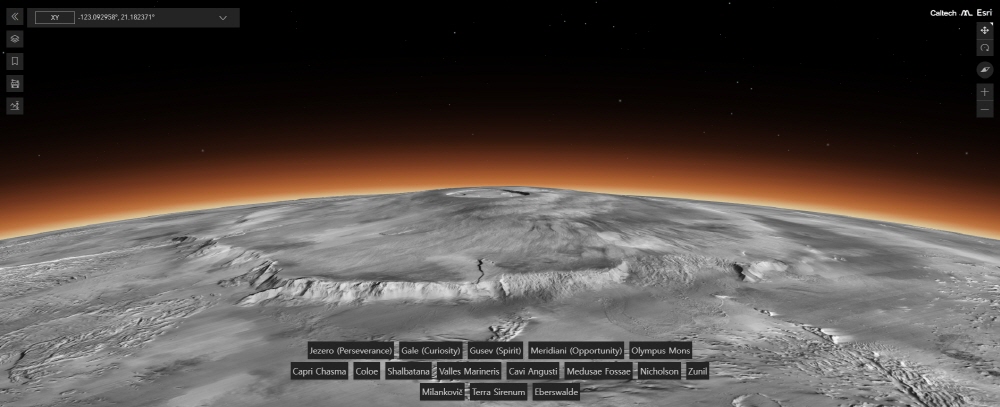 이곳에선 구글어스처럼 화성을 볼 수 있다. 드래그해 지도를 탐색하거나 +/- 버튼으로 줌인과 줌아웃도 가능하다. 화성 표면은 픽셀당 5m 정밀도로 촬영됐으며 지형 고도에 맞게 입체적으로 이뤄져 있다. 제제로 분화구나 태양계에서 가장 높은 화산인 올림포스산 등도 버튼 한 번에 바로 이동할 수 있다. 퍼러비어런스 등 탐사기 이동 경로도 표시된다. 참고로 올림포스산은 고도 기준면으로부터의 고도는 2만 5,000m 이상으로 에베레스트 3배가 넘는다. 관련 내용은 이곳에서 확인할 수 있다.