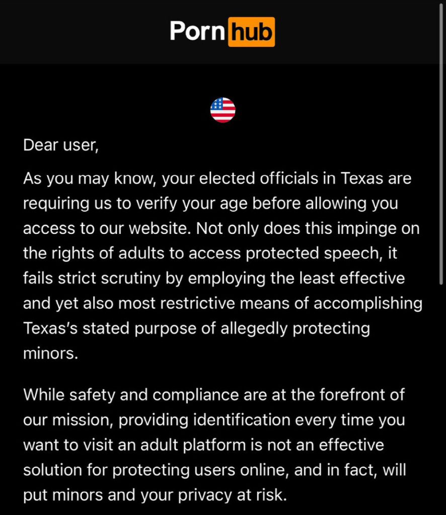 폰허브는 “법 집행에 결함이 있다”고 지적하며 해결책이 제시될 때까지 텍사스주 등에서의 접속을 완전히 차단한다고 밝혔다. 이에 따라 텍사스주에서 폰허브에 접속하려 하면 “연령 확인이 의무화되어 있다”는 메시지만 표시되고 콘텐츠는 전혀 볼 수 없다.