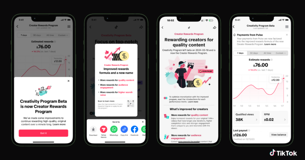 이에 틱톡은 크리에이티비티 프로그램 베타를 2024년 3월 19일자로 종료한다고 발표한 것. 이어 크리에이티비티 프로그램 베타를 대체하는 새로운 크리에이터 보상 프로그램으로 크리에이터 리워드 프로그램(Creator Rewards Program)을 공식 시작한다고 밝혔다.