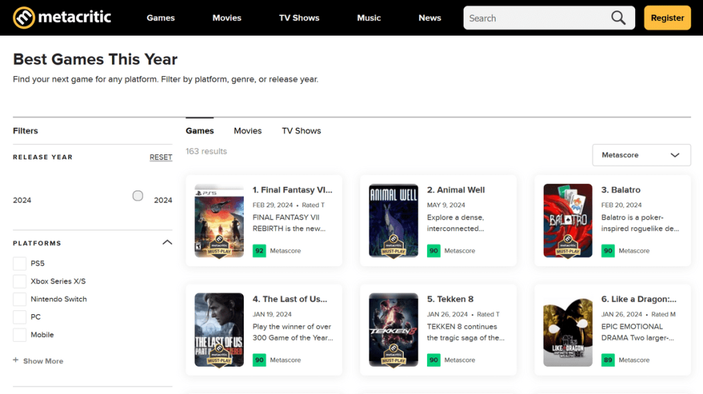 1위는 파이널 판타지VII 리버스(FINAL FANTASY VII REBIRTH). 1997년 플레이스테이션용으로 출시된 게임인 파이널 판타지VII를 리메이크해 플레이스테이션 5용으로 출시한 작품인 파이널 판타지VII 리버스가 1위를 차지했다. 리뷰어 149명 평가를 기반으로 한 메타 점수는 100점 만점에 92점이며 사용자 4,041명 평가를 기반으로 한 사용자 점수는 10점 만점 중 9.1점이다. 게임리뷰 사이트 게임맥은 간단히 말해 파이널 판타지VII 리버스는 스퀘어에닉스 전 역사 중에서도 최고 걸작 중 하나라고 평가하며 만점을 부여했다.