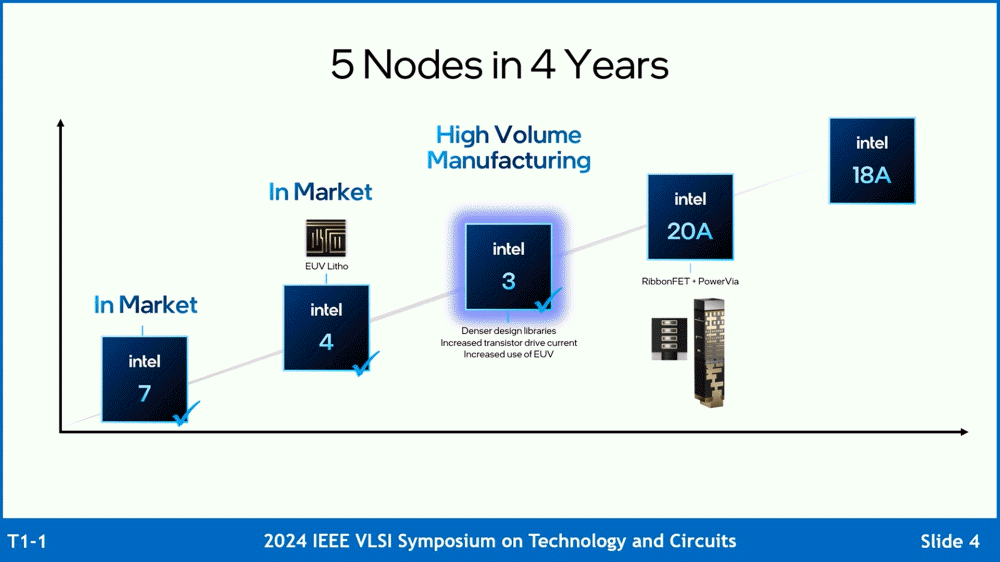 인텔은 2021년 4년간 5개 프로세스 노드를 개발한다(5N4Y)는 목표를 세웠고 이미 인텔 7과 인텔 4 대량 생산이 시작됐다. 더불어 인텔은 인텔 3에 대응하는 반도체 제조라인을 미국 오레곤주와 아일랜드 공장에 배치하고 2023년 말까지 테스트 생산을 완료했다. 이어 이번에 인텔은 두 공장에서 인텔 3 대량 생산을 시작했다고 발표한 것이다.