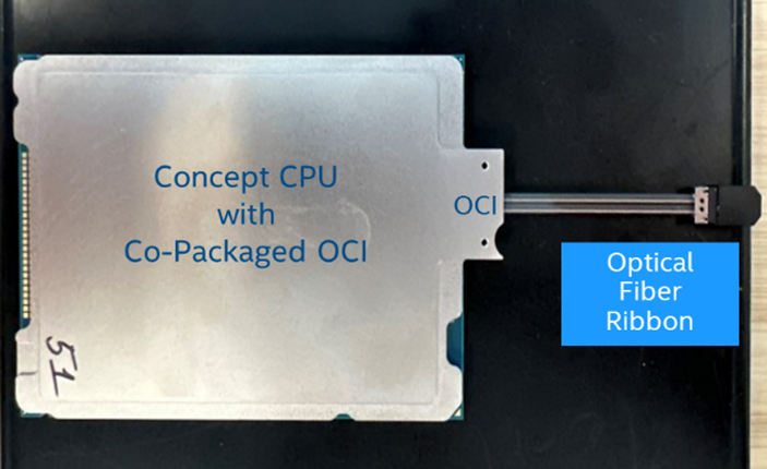 OCI 구현 데모로 인텔은 최대 4Tbps 양방향 데이터 전송이 가능한 완전 통합 OCI 칩렛을 개발했다. 이 데모에서는 OCI가 CPU와 패키징되어 있지만 인텔은 GPU나 AI 칩 IPU, 그 외의 SoC에도 OCI를 통합할 수 있다고 밝혔다.