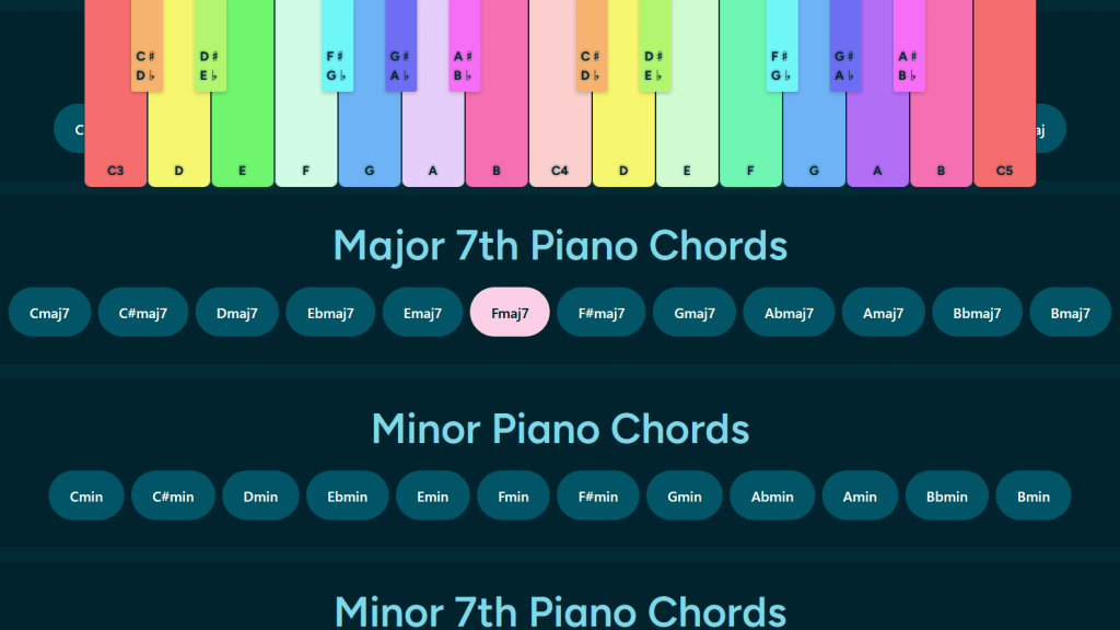 이곳에 가면 다채로운 피아노 건반이 표시된다. 건반을 클릭하면 소리가 난다. 건반 아래에 있는 스위치(colorize keys)를 클릭하면 색상이 파란색과 분홍색 2가지로 나온다. 아래에는 코드가 작성된 버튼이 있다. 코드 버튼을 누르면 코드가 울리며 또 화음을 구성하는 소리 건반 색이 바뀐다. 코드 버튼을 누르는 것만으로 이 화음을 구성하는 소리가 시각적이나 청각적으로도 알 수 있다고 한다. 예를 들어 C메이저의 경우 C, E, G 3개다. E마이너는 E, G, B 3개다.