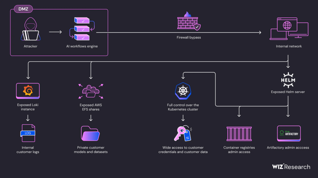 AWS 시크릿을 사용해 AWS S3에 저장된 AI 코어 서비스 및 고객 팟에서 출력되는 대량 로그에 액세스할 수 있었다고 한다. 내부 네트워크에는 Loki 외에도 AWS EFS(Elastic File System) 인스턴스도 발견됐다. EFS 인스턴스는 기본적으로 공개로 설정되어 있어 액세스만 할 수 있다면 인증 없이 파일을 보거나 편집할 수 있다. 위즈는 실제로 사용되고 있는 고객 훈련 데이터 등 대량 AI 데이터를 발견했다.