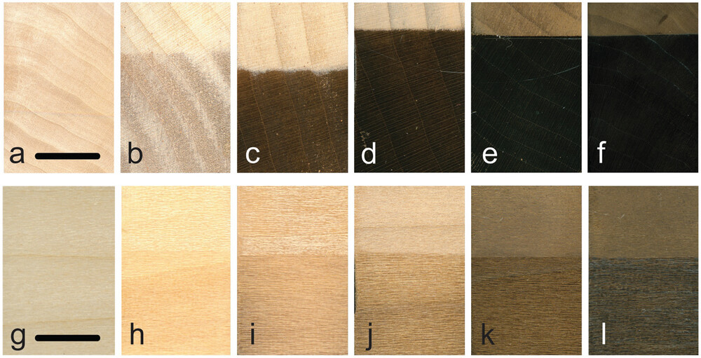 시나무 재료 섬유에 대해 수직으로 절단한 면, 하단은 섬유에 대해 평행하게 절단한 면에 플라즈마 처리를 한 모습을 보면 왼쪽에서 오른쪽으로 갈수록 플라즈마 출력이 높아지며 그 중에서도 상단 오른쪽 끝 f는 연륜이 거의 보이지 않을 정도로 검게 변한 것을 알 수 있다.