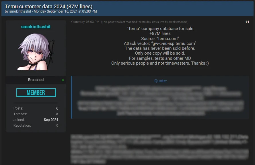 9월 16일 smokinthashit이라는 위협 행위자가 언더그라운드 포럼(BreachForums)에 테무로부터 8,700만 건에 이르는 데이터를 탈취했다고 게시하며 데이터 구매자를 모집했다. 위협 행위자는 증거로 사용자명, ID, IP 주소, 이름, 생년월일, 성별, 배송 주소, 전화번호, 해시화된 비밀번호 등을 포함한 데이터 샘플을 공개했다.