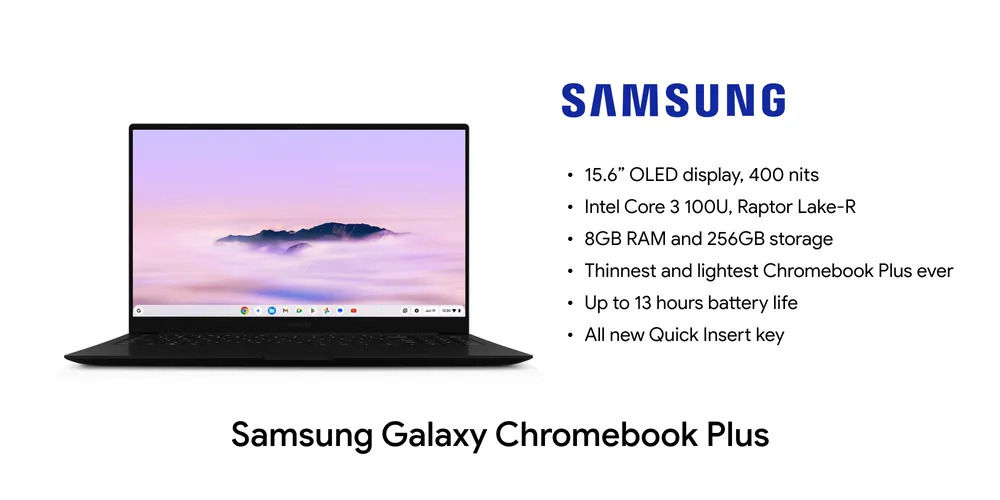 10월 출시 예정인 갤럭시 크롬북 플러스는 15.6인치 OLED 디스플레이를 탑재하면서도 무게는 단 1.17kg, 두께는 11.8mm로 구글은 가장 얇고 가볍다고 평가하고 있다. 또 프로세서로는 인텔 코어 3 100U가 사용됐으며 RAM은 8GB, 저장 공간은 256GB다.