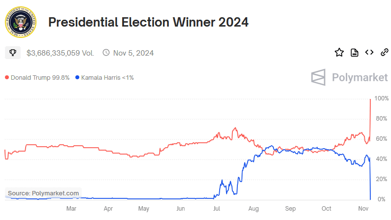 폴리마켓에서 진행된 2024년 미국 대선 승자 예측 결과를 보면 5월부터 트럼프 측 승리를 예상하는 사용자가 다수를 차지했으며 6월 TV 토론 직후 바이든 승률이 급락했다. 이후 민주당 후보가 해리스로 교체되면서 접전 상태가 됐지만 10월 들어 트럼프가 유리하게 기울었고 투표일까지 트럼프가 우세한 상태가 지속됐다.