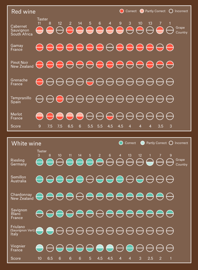 옥스퍼드대학과 케임브리지대학이 개최하는 와인 테이스팅 콘테스트(Varsity blind wine tasting match) 2017년 결과를 보면 참가자는 레드와 화이트 와인 6종을 테이스팅하고 각각 포도 품종과 산진에 대해 답했다. 조합 패턴으로 하면 우연이라고 말할 수 없는 정밀도로 정답을 맞추며 와인 종류에 따라 정답률이 높은 것과 낮은 게 분명하게 나뉘어져 있다. 이 결과를 보면 전문가는 와인 맛을 어느 정도 식별할 수 있다고 생각하는 게 타당하다.