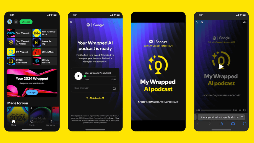 한편 스포티파이는 매년 12월에 해당 연도에 자사 서비스에서 자주 들은 곡과 아티스트를 정리한 스포티파이 정리(Spotify Wrapped) 서비스를 자동으로 제공하고 있다. 이 스포티파이 정리에 구글 노트북LM(NotebookLM)을 결합해 1년간 사용자 음악 이력을 AI 호스트 2명이 대화 형식으로 되돌아보는 팟캐스트 프로그램을 자동 생성하는 새로운 기능인 스포티파이 정리 AI 팟캐스트를 추가했다고 구글과 스포티파이가 발표했다.