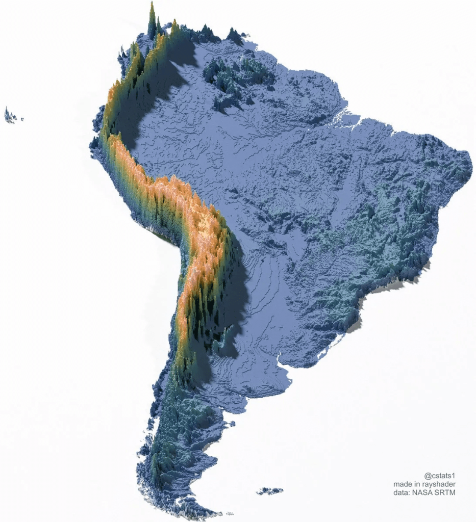 바람은 적도 부근에서는 서쪽으로 불고 남쪽에서는 동쪽으로 불지만 안데스 산맥은 그 둘 다를 막아버린다. 적도 부근에서는 대서양에서 오는 습기를 막기 때문에 칠레 북부가 건조해지고 더 남쪽에서는 태평양에서 오는 습기를 모두 막아버리기 때문에 아르헨티나 남부가 건조해진다. 그래서 칠레는 남부만 초록으로 뒤덮여 있다. 남부라고 해도 남단은 남극에 너무 가까워서 자연스럽게 사람들은 중부 근처에 모이게 된 것이다. 관련 내용은 이곳에서 확인할 수 있다.