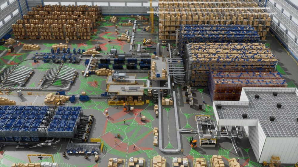 다음은 AI 로봇 가상 테스트 환경인 메가. 메가는 공장 내부 구조와 기계 배치를 디지털 공간에서 재현하는 시스템으로 로봇 동작을 가상 공간에서 테스트하거나 최적화할 수 있는 환경을 제공한다. 이미 KION그룹은 메가를 활용해 창고용 로봇 개발을 진행 중이다. 관련 내용은 이곳에서 확인할 수 있다.