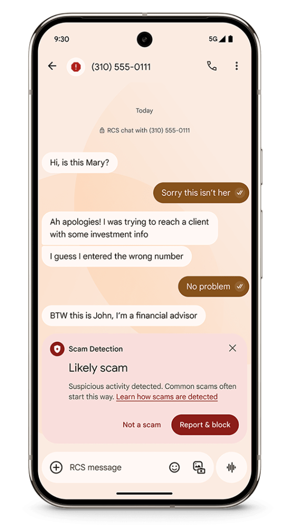 구글이 발표한 기능은 메시지 사기 탐지 기능과 통화 사기 탐지 기능 2가지다. 메시지 사기 탐지 기능은 기기 내 AI가 SMS, MMS, RCS 메시지에서 사기로 의심되는 패턴을 감지하면 사용자에게 사기 가능성 경고 메시지를 자동 발송한다. 사용자는 표시된 경고를 바탕으로 사기 아님 또는 신고 및 차단 중 선택할 수 있다.