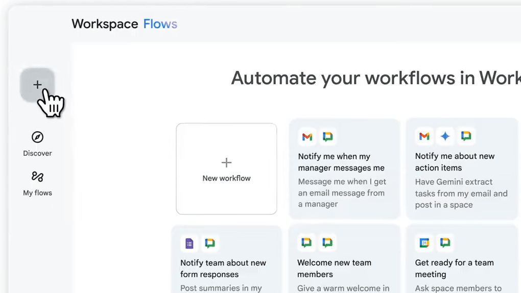 구글 워크스페이스 플로는 구글 워크스페이스에 새롭게 추가된 코드 없는 워크플로 자동화 도구다. 이 기능을 사용하면 프로그래밍 지식이 없어도 G메일이나 구글 드라이브, 캘린더, 스프레드시트, 채팅 등 앱을 조합해 일상 업무를 효율적으로 자동화할 수 있게 된다. 예를 들어 특정 조건으로 이메일을 수신하면 자동으로 드라이브에 파일을 저장하고 이를 팀에 채팅으로 알리는 일련의 흐름을 화면상에서 단계별로 설정해 구현하는 게 가능하다.