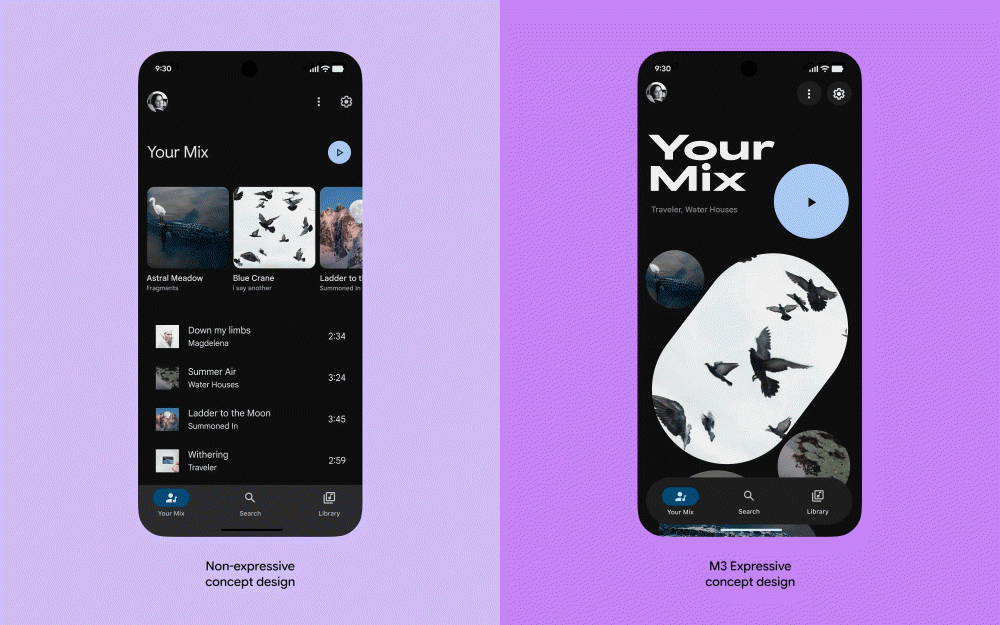 구글은 머티리얼 3 익스프레시브에 대해 표현력이 풍부한 디자인 기본은 색, 형태, 크기, 움직임, 공간 표현이라며 머티리얼 3 익스프레시브는 대담한 형태와 색상 사용이 특징으로 편안한 사용자 경험을 만든다고 설명했다.