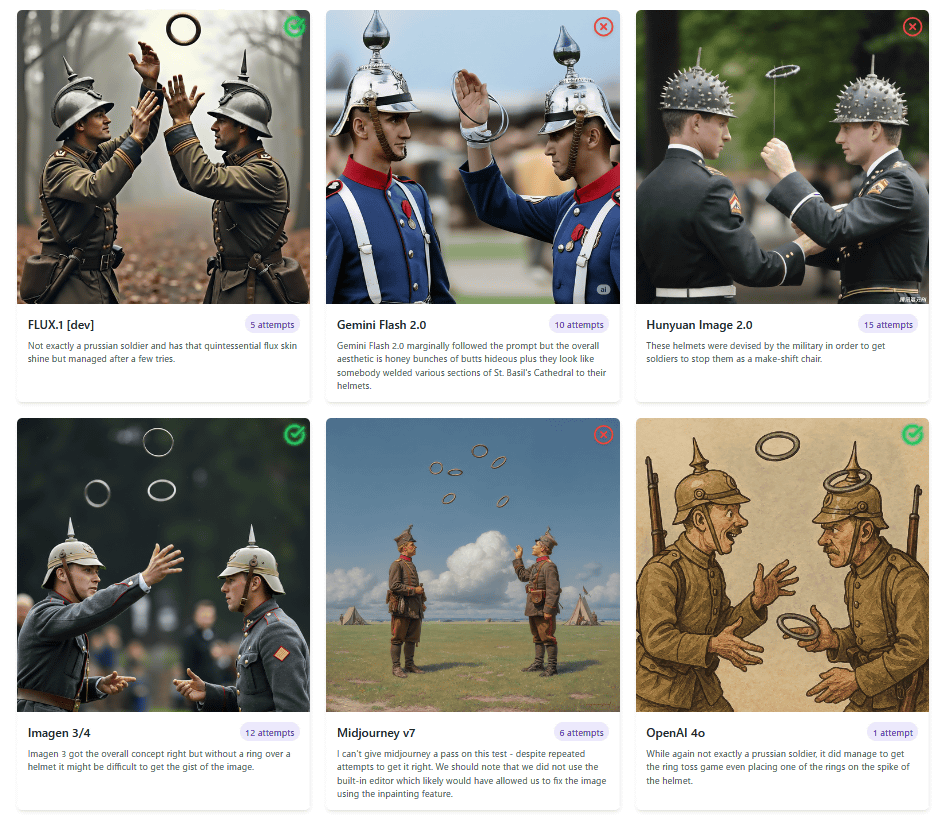 이미지 생성 AI 6종에 스파이크가 달린 헬멧을 착용한 2명의 프로이센 병사가 마주보며 금속 링을 서로의 헬멧 스파이크를 향해 던지는 게임을 하고 있다는 프롬프트를 입력한 결과는 이미지에서 확인할 수 있다.