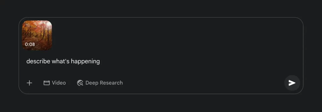 동영상을 올리려면 제민나이 앱 또는 브라우저 버전을 열고 + 아이콘을 선택하면 된다. 이어 프롬프트를 입력하고 전송 버튼을 누르면 몇 초 만에 분석 결과가 나온다.