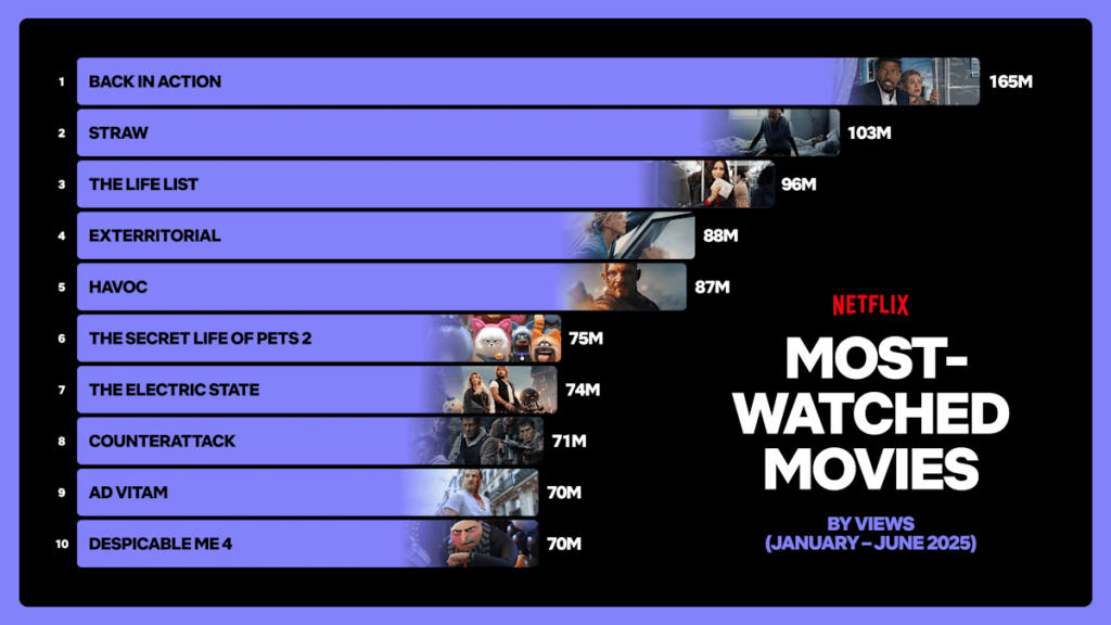 또 2025년 상반기 가장 많이 재생된 영화 톱 10에서 가장 인기를 얻은 작품은 백 인 액션(Back in Action)으로 재생 횟수는 1억 6,500만 회였다.