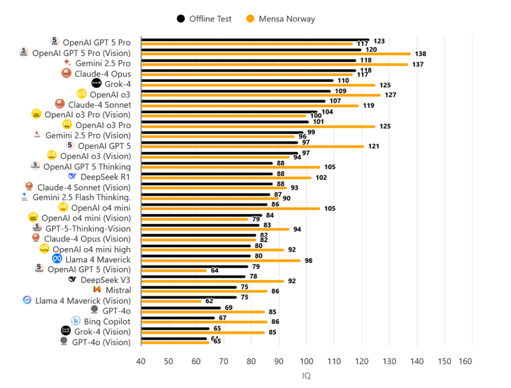 IQ 테스트 결과를 정리한 자체 제작 테스트에서 가장 우수한 성과를 거둔 건 오픈AI GPT-5 Pro로 IQ는 123이었다. 멘사 테스트에서는 GPT-5 Pro 이미지 읽기 기능 탑재 모델이 최우수였으며 IQ는 138이었다. GPT-4o 이미지 읽기 기능 탑재 모델 IQ가 65인 것을 고려하면 큰 진전이다. 또 세계 최강 AI라는 문구로 등장한 Grok 4는 자체 제작 테스트에서 IQ 110, 멘사 테스트에서 IQ 125라는 결과를 기록했다. 각 AI IQ 추이를 보면 Claude 3.7 Extended와 Claude 3.5 Sonnet IQ가 매월 크게 향상되고 있다.