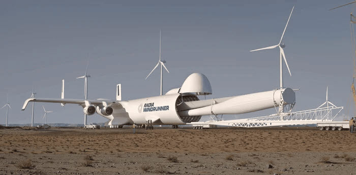 라디아가 개발하는 비행기 윈드러너 전장은 108m로 현존하는 최대 비행기보다 60% 길고 대형 제트여객기 보잉747 12배에 달하는 화물공간을 가진 거대한 기체다. 운반하는 건 단 하나, 거대한 블레이드다.