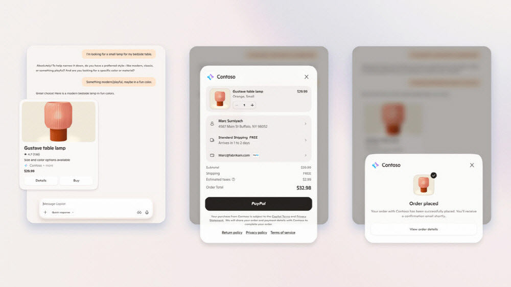 코파일럿 체크아웃은 코파일럿과의 대화 중에 그대로 쇼핑할 수 있게 되는 기능. 코파일럿 체크아웃에서 마이크로소프트와 제휴한 페이팔 에이전틱 커머스 담당 부사장인 마이크 에드먼즈는 제휴를 통해 신뢰성 높은 코파일럿 커머스 인프라를 통해 가맹점 AI 도입과 스케일업을 실현한다며 이 파트너십을 통해 수천만 가맹점으로 구성된 자사 생태계가 효율적으로 성장하고 소비자에게는 페이팔로 결제할 때 편안하고 직관적인 쇼핑 경험을 제공할 수 있게 된다고 말했다.