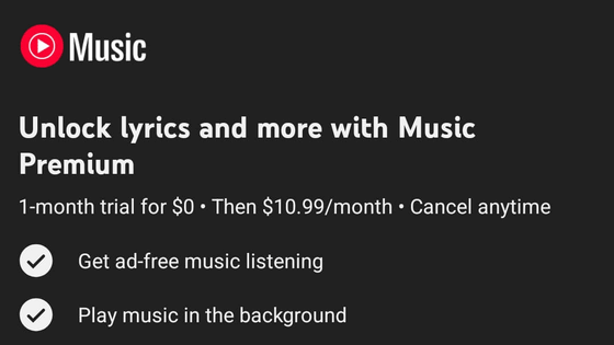 지금까지 유튜브 뮤직에서는 누구나 곡 가사를 볼 수 있었다. 하지만 구글은 유튜브 프리미엄이나 뮤직 프리미엄 구독 사용자에게만 가사를 보여주는 테스트를 실시하고 있다. 이 제한이 계정에 적용되면 재생 중 화면 중앙 탭 상단에 새로운 카드가 표시되며 남은 재생 횟수는 ○○회, 프리미엄으로 가사를 시청할 수 있다고 표시된다고 한다. 또 무료 회원 사용자가 표시할 수 있는 가사는 처음 몇 줄까지이며 나머지는 흐릿하게 처리되어 스크롤할 수 없게 된다.