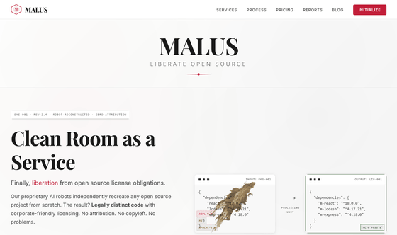 이런 AI에 의한 클린룸 설계를 전문으로 하는 서비스로 발표된 게 MALUS다. MALUS는 저작권 표시의 번거로움, 라이선스 인수로 인한 코드 공개 의무, 복잡한 소프트웨어 간 의존 관계에 따른 라이선스 관리 등을 오픈소스 문제점으로 지적하며 이 모든 것에 대처할 필요가 없는 해결책을 제공한다고 밝히고 있다.