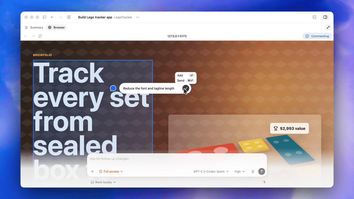 다음은 앱 내 브라우저에서 직접 지시 가능. 이번 업데이트로 코덱스와 웹이 네이티브로 연동될 수 있게 됐다. 코덱스에 앱 내 브라우저가 탑재됐으며 사이트 일부를 지정해 직접 변경 내용을 지시할 수 있게 됐다. 예를 들어 캐치프레이즈 부분을 지정해 폰트를 작게 하고 문장도 짧게 해달라고 지시한다. 그러면 코덱스가 자동으로 처리를 수행한다.