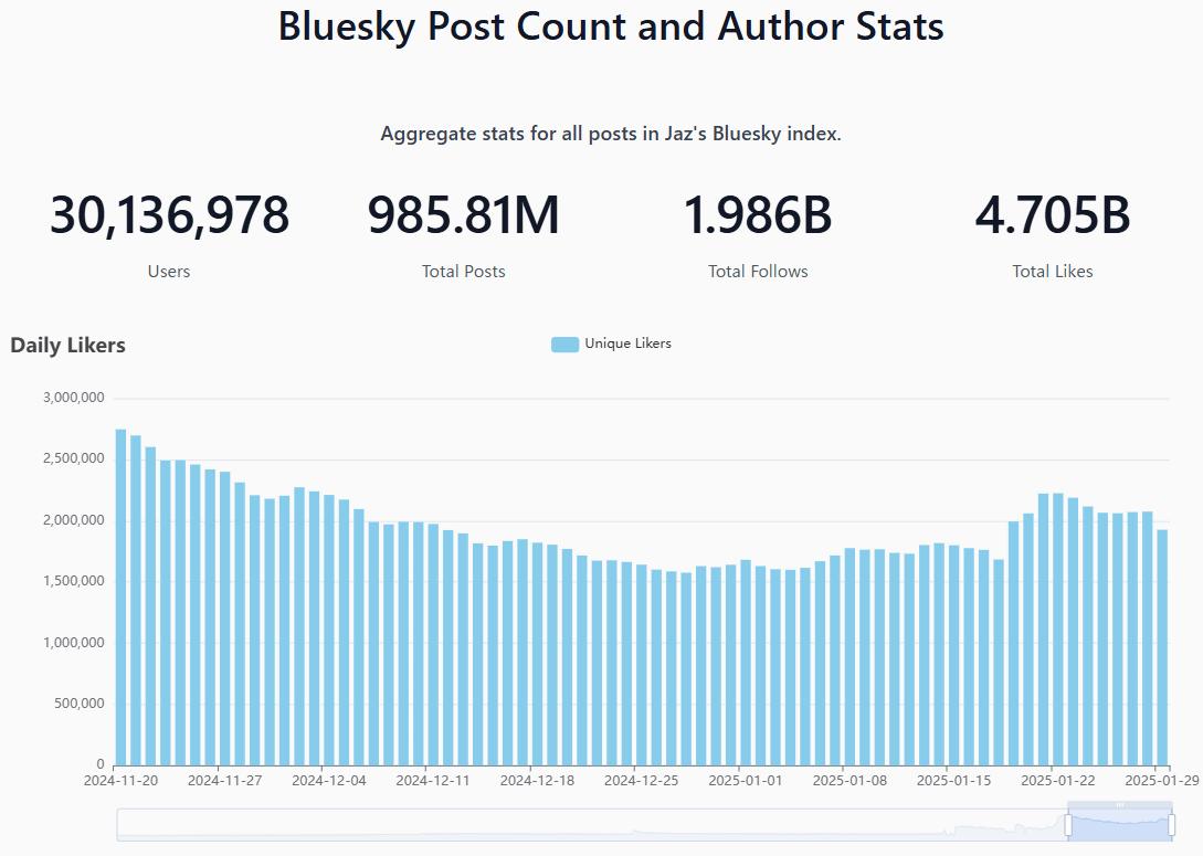SNS 블루스카이(Bluesky) 사용자 수가 3,000만 명을 돌파했다고 데이터(Stats for Bluesky by Jaz)를 통해 밝혀졌다. 해당 데이터 수치는 계속 업데이트되고 있으며 ...