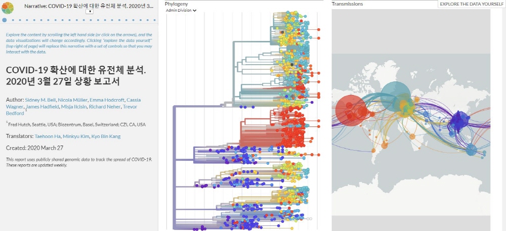 전 세계 연구기관이 제공한 환자로부터 채취한 바이러스 유전자 배열 데이터를 기반으로 바이러스 감염 확대 모습을 세계 지도와 계통수를 이용해 그려서 ...