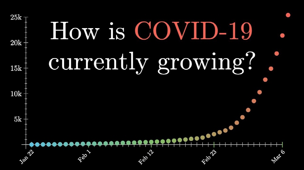 코로나19는 1월 말부터 중국 국외로 유행이 확대되고 있다. 중국을 뺀 지역 내 감염자 수를 정리한 그래프를 유튜브 수학 해설 채널(3Blue1Brown)이 ...