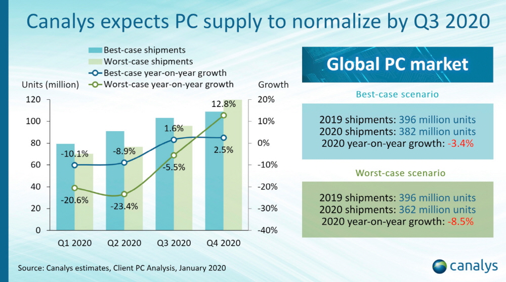 시장조사기관 카날리스(Canalys)가 신종 코로나 바이러스 유행에 따라 2020년 PC 전 세계 출하 대수는 적어도 3.3%, 많게는 9%까지 감소할 가능성이 있다고 ...