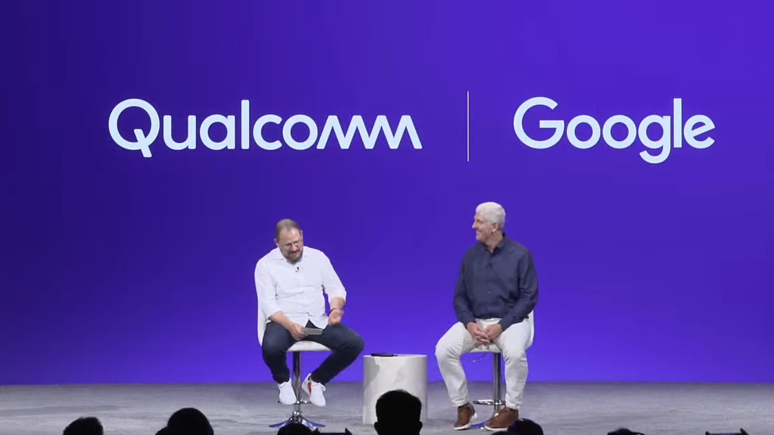 퀄컴이 개최한 이벤트인 스냅드래곤 서밋 2025에서 퀄컴 크리스티아노 아몬 CEO와 구글 디바이스 및 서비스 담당 부사장인 릭 오스터로가 PC용 안드로이드와 ...