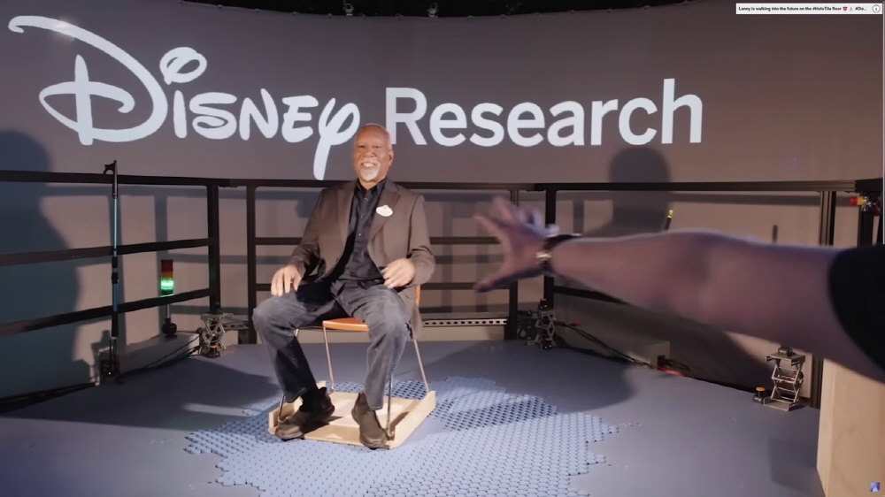 디즈니 리서치(Disney Research) 펠로우이자 월트디즈니이매지너링(Walt Disney Imagineering) 연구개발팀 래니 스무트(Lanny Smoot)가 가상 공간 내를 자유롭게 걸을 수 있는 전방위 트레드밀을 ...