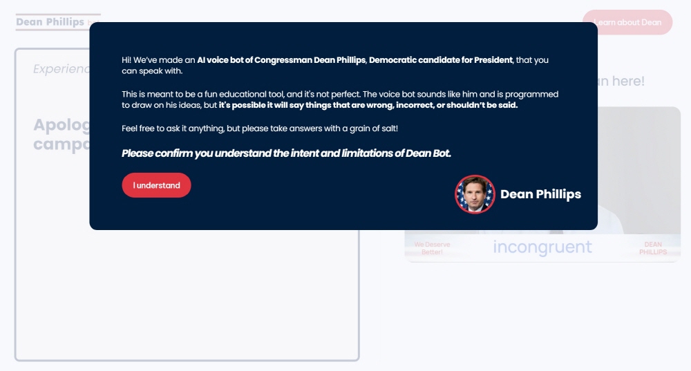 미국 민주당 2024년 대선 후보자인 딘 필립스 하원 의원을 모방한 채팅봇인 딘봇(Dean.Bot)이 오픈AI에 의해 삭제되고 채팅봇을 개발한 스타트업인 델파이AI(Delphi AI) ...