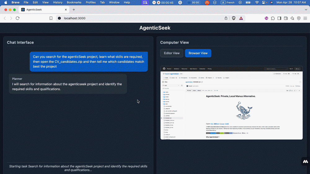 에이전틱시크(AgenticSeek)는 로컬에서 작동하는 AI 에이전트로 PC상 파일을 검색, 코드를 작성, 웹상에서 정보를 검색하는 등 작업을 실행할 수 있다. AI 모델은 ...