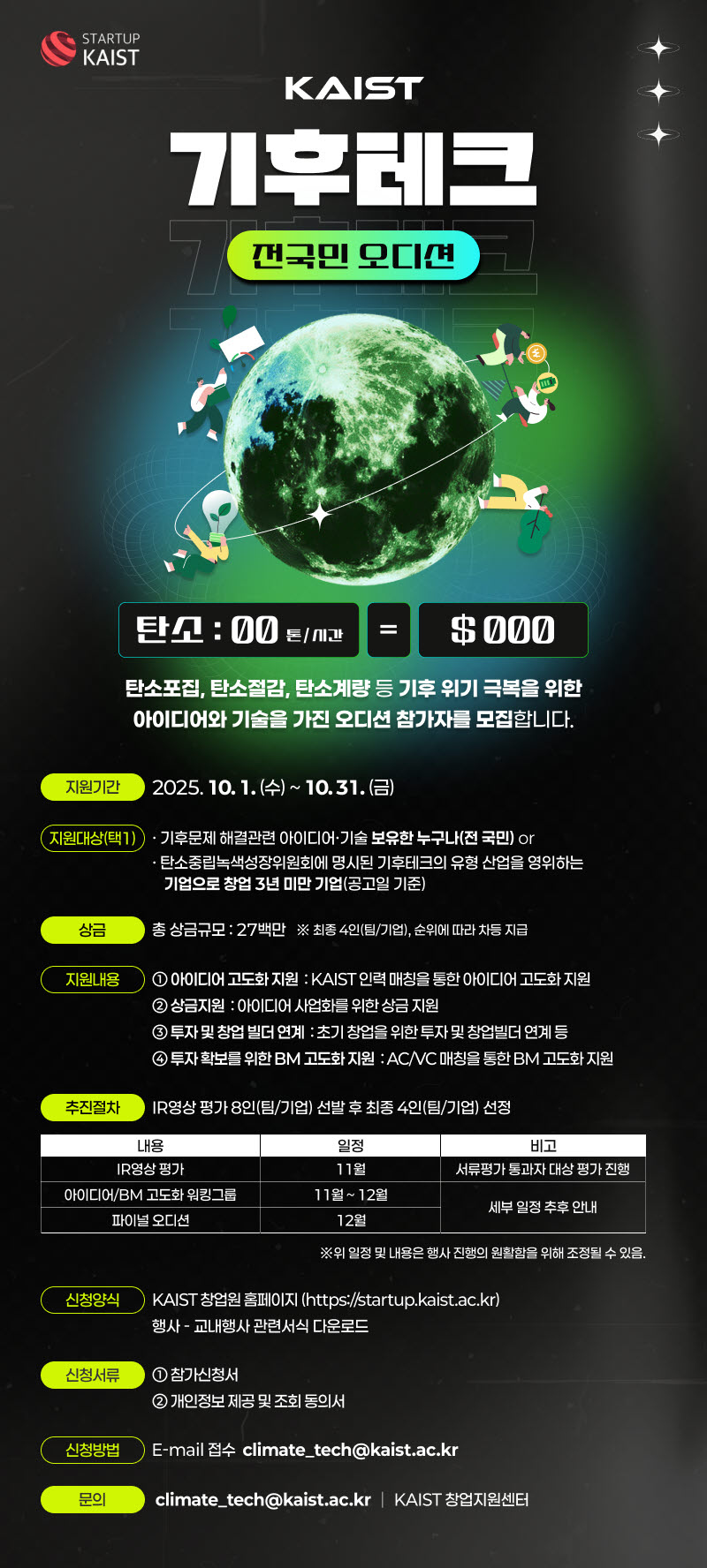 2025 KAIST 기후테크 전 국민 오디션 참가자를 아래와 같이 모집하오니, 많은 관심과 참여 바랍니다.