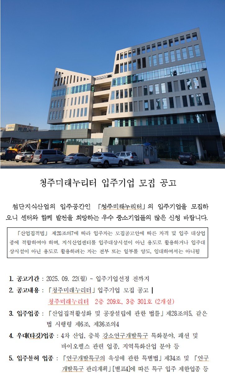 – 소재지 : 충북 청주시 오창읍 양청송대길 10 청주미래누리터 지식산업센터