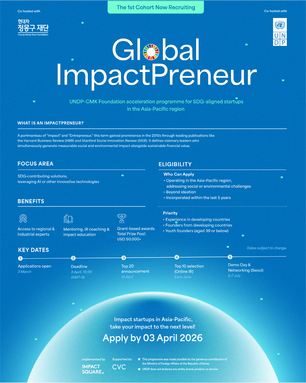 본 프로그램은 글로벌 네트워크와 산업 전문성을 제공하여 아시아 태평양 전역의 임팩트 중심 기업가 정신의 확대를 목표로 합니다. 지속가능발전목표(SDGs)에 기여하며, 인공지능(AI) 또는 혁신 기술 기반의 솔루션을 보유한 창업가들의 도전을 기다립니다.