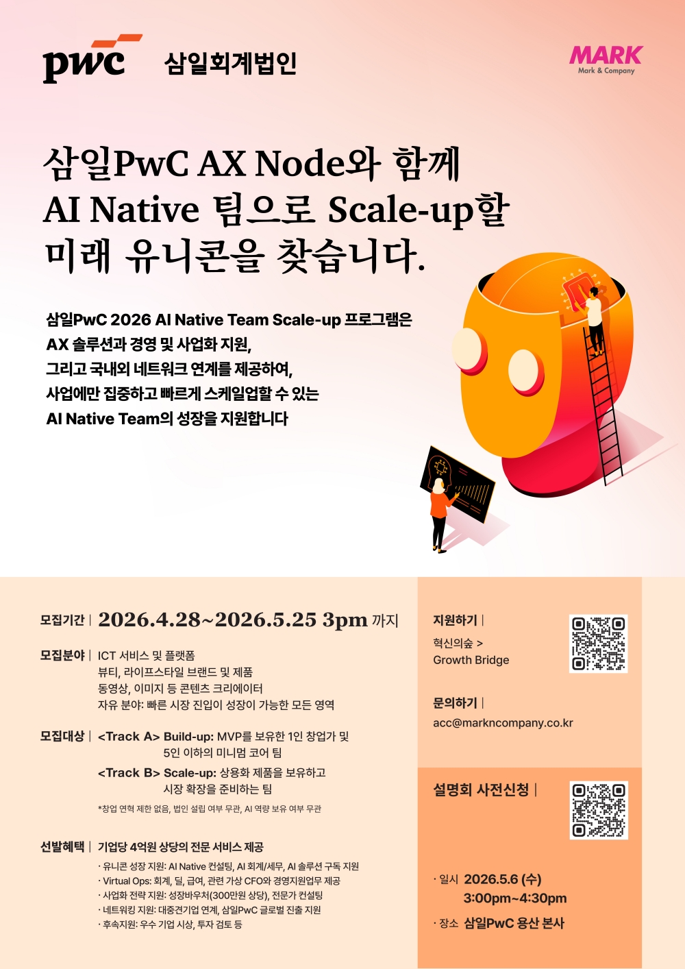 삼일PwC와 마크앤컴퍼니가 공동 주관하는 ‘AI Native Team Scale-up 프로그램’의 참가팀 모집을 시작하여 연락드립니다.
