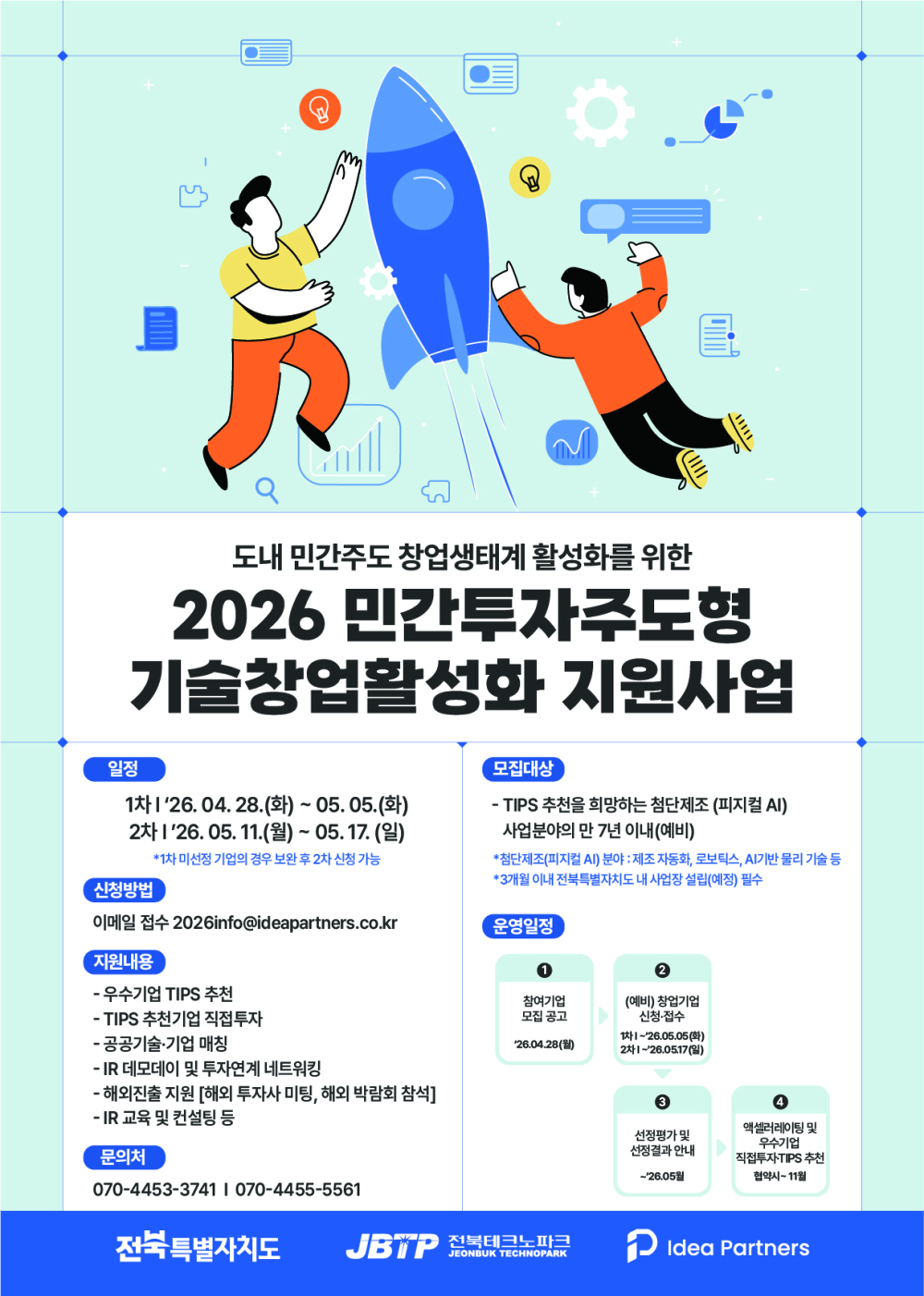 창업 초기부터 TIPS 도전까지, 투자멘토링보육 등의 체계적인 지원으로 미래유망 창업기업을 육성하는『2026년 민간투자주도형 기술창업 활성화 지원사업』에 참여할 도내 유망 창업 (예비)기업을 다음과 같이 모집하오니 많은 관심과 참여 바랍니다.